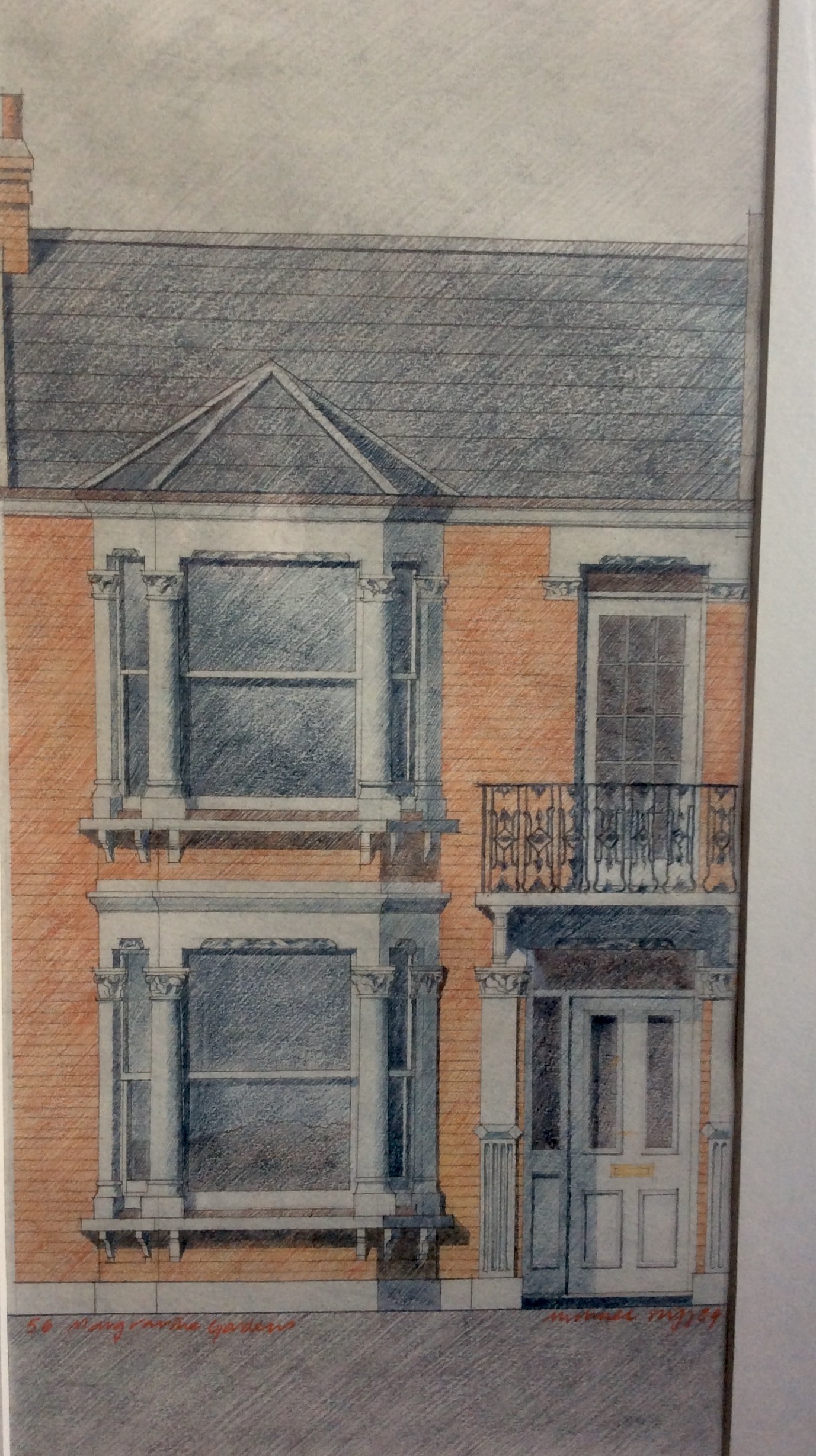 My house has what estate agents call “all the usual offices”; a strange expression as it has everything except an office. This drawing was done by Mike Stiff, of Stiff + Trevillion, in 1984. It’s a late Victorian terraced house with some original features, including a functioning coal hole in the path leading up to the door and some attractive tiling on the path.