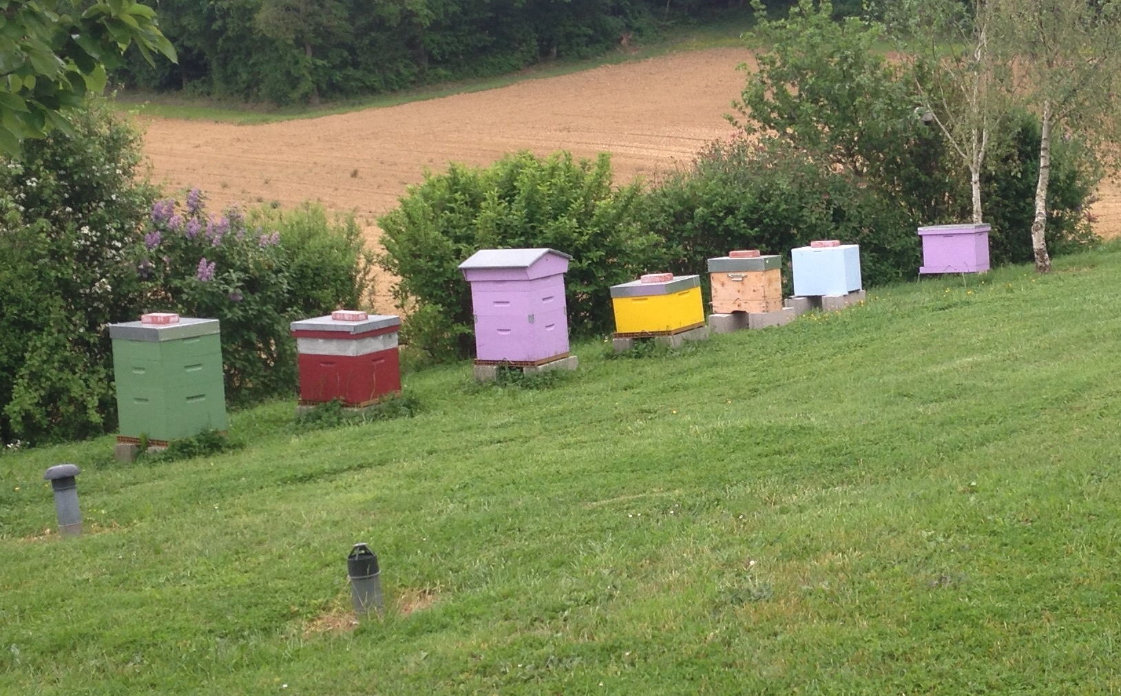 Continuing the bee theme, we passed this cheerful terrace of beehives.