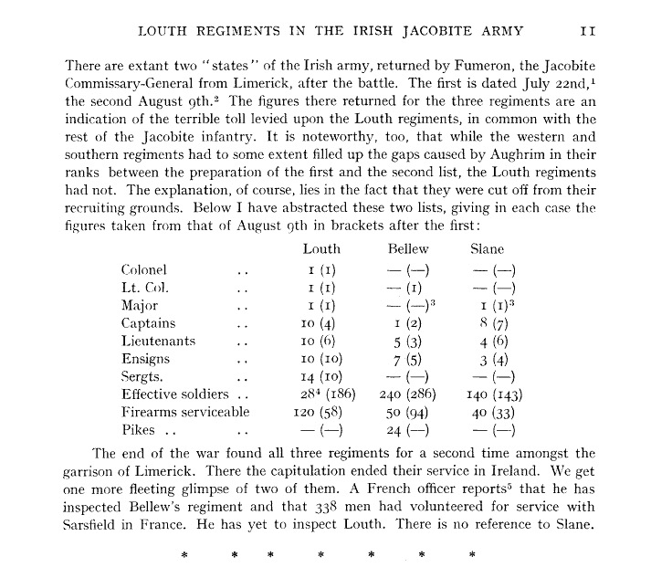 The parlous state of the Bellew regiment after Aughrim is set out by Diarmuid Murtagh in an article in the Journal of the Louth Archaelogical Journal (1953) of which this is an extract. The year is 1691, after Aughrim was fought on 12th July.