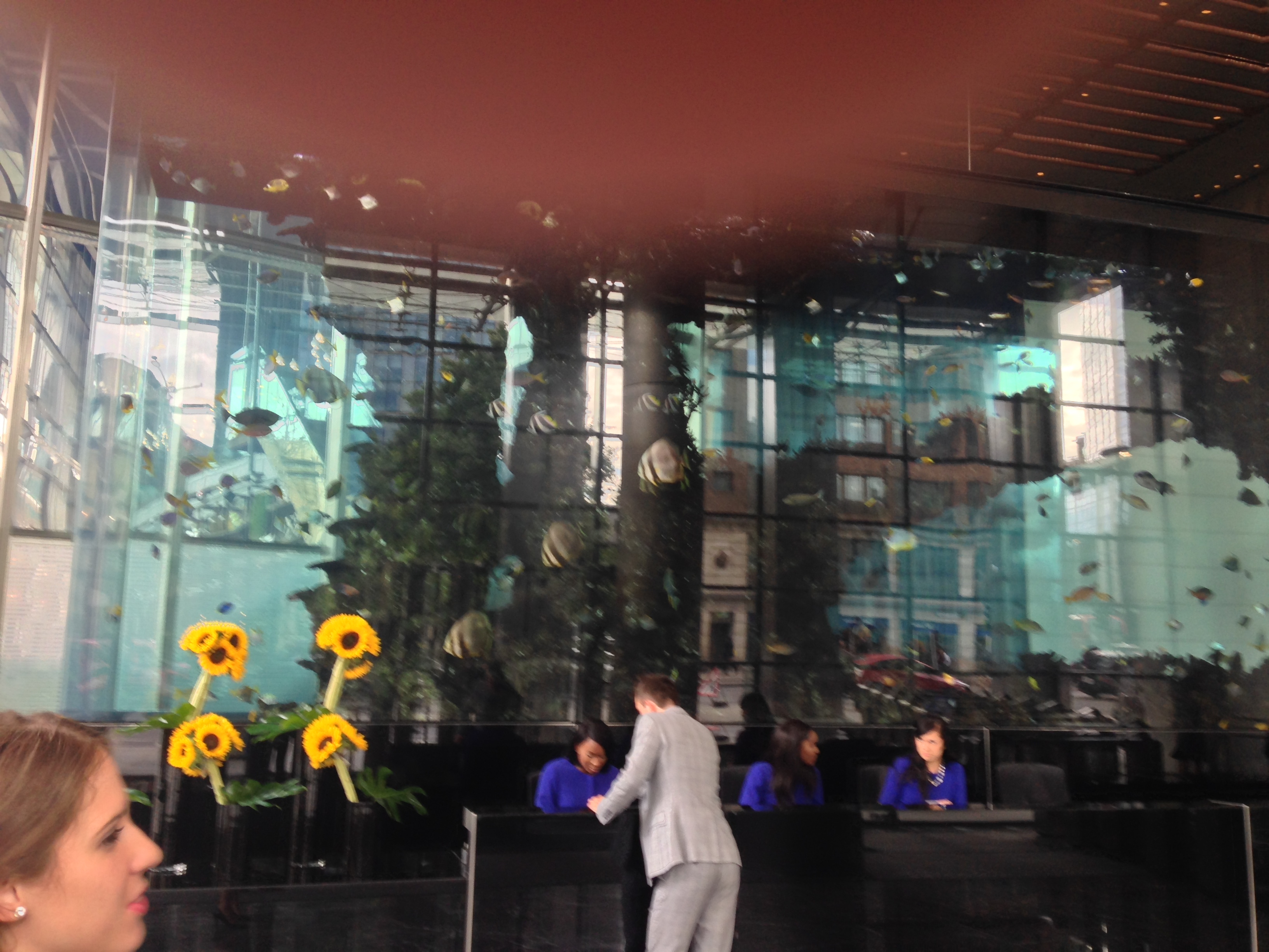 Yesterday I took a look at the largest private aquarium in Europe; 18,500 gallons of water and more than 1,000 fish from the Great Barrier Reef swimming around feeling homesick. It is on the ground floor of the Heron Tower which, conveniently, is across the road from St Botolph without Bishopsgate. The photograph is not very good but I was put off by the receptionist, bottom left, who told me that photography is forbidden. In the trade it’s called a “grab shot” which is why you have to look rather carefully to see even a few of the shoals of fish living in some seriously expensive real estate.