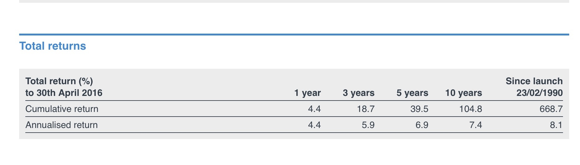Meanwhile McInroy & Wood, who I periodically praise here, are not quite as dull as you might think. They differ from Brunner in that they invest in bonds as well as equities. In the last six months they have increased their holdings in bonds (mostly UK and US Treasuries) to 40%, reflecting their view that from moving sideways equities may break to the downside. If they are right they will outperform their peers with a greater exposure to equities. Their charges are higher than for an investment trust but they earn their fees, I hope, by this re-allocation of assets. They have been chugging along pretty impressively since 1990. Here is the record for their flagship Balanced Fund which yields 1.8%. The numbers assume that the dividends have been re-invested. Of course they haven’t, they have been spent paying the bills.