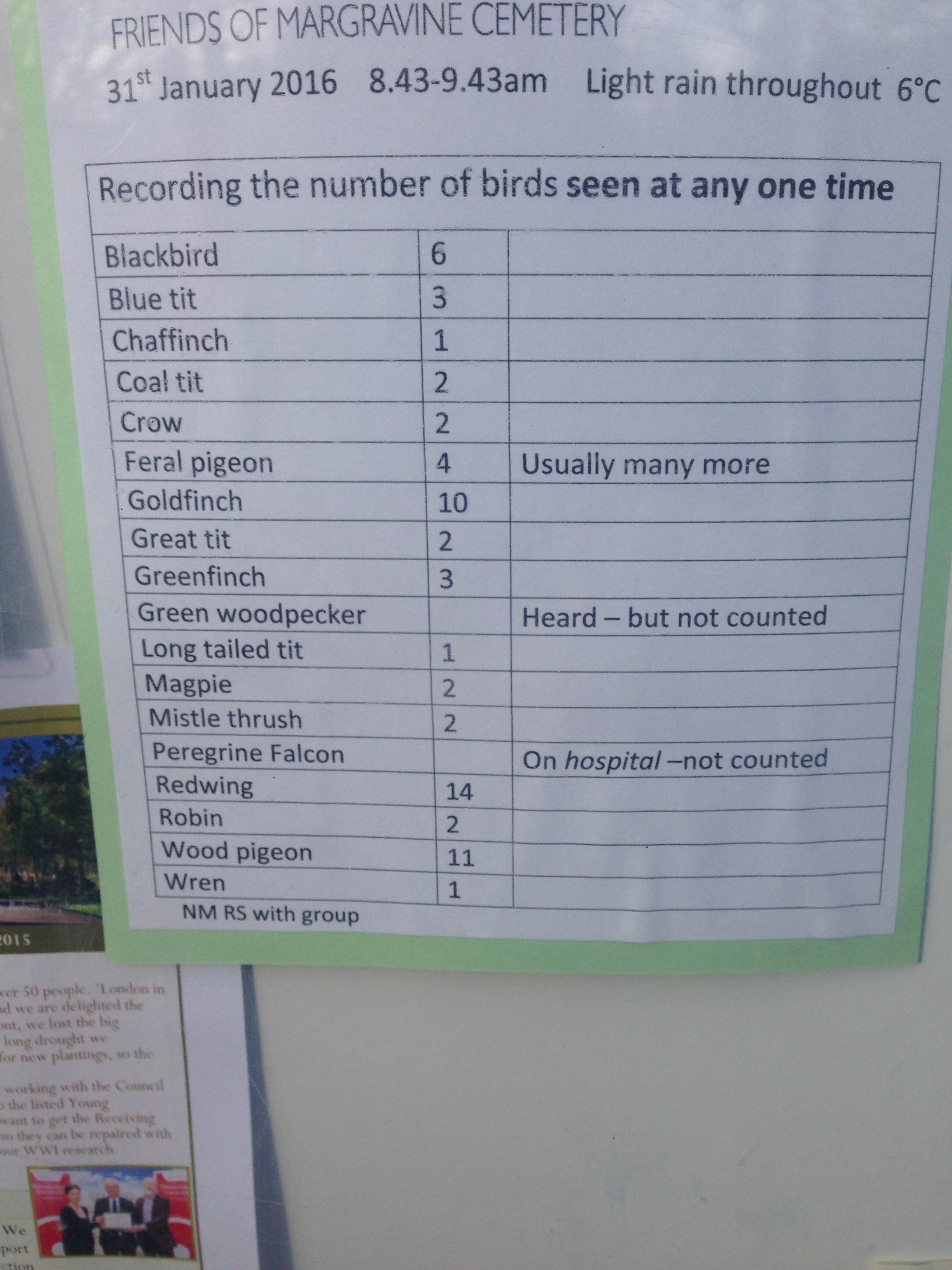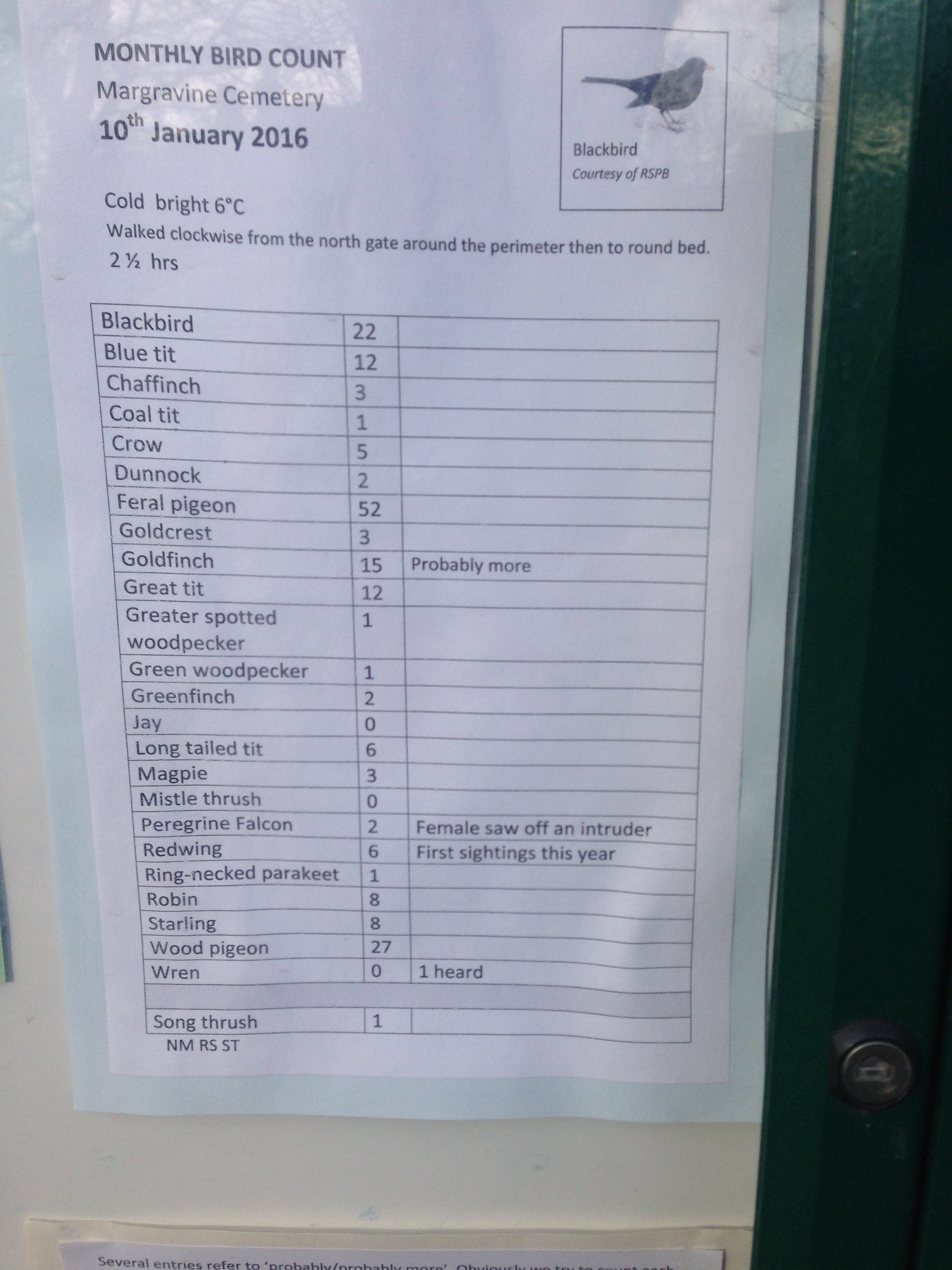 Walking up my street to Barons Court station I pass Margravine Cemetery. It covers 16.5 acres, opened in 1868 and closed, for burials, in 1951 – so it’s lucky I’ve made other arrangements (see A Grave Matter). Sunday 31st January this year was the designated day to go out and count the birds in your garden and fellow-blogger, the Northern Scrivener, did just that. He may be surprised to read the tally from Margravine Cemetery; I was. I don’t live in Arcadia but it’s not a concrete wilderness either.
