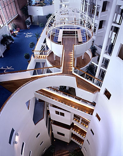 I see it from my bathroom window everyday but I have never been inside. The architect is Ralph Erskine and his intentions were good. You now know that lots went wrong. Commercially it has not been a success, having trouble attracting tenants although after a £20 million make-over in 2006 expanding the office space from 12,100 square metres to 15,600 square metres it seems to be on a sounder footing. The other problem is that the curved wall of The Ark adjacent to the Piccadilly and District lines reflects the noise of the trains onto the houses on the other side of the tracks. A line of trees has to some extent alleviated this nuisance to neighbours.