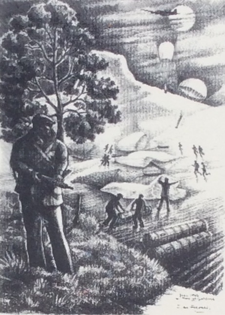 Yesterday there was mention of activities by the French Resistance in Tarn in WW II. This morning let’s flesh this out. This picture works up a bit of atmosphere depicting the Resistance scooping up parachutes dropped by the RAF. Rather improbably it seems to be a full moon which was a no-no for discrete drops.
