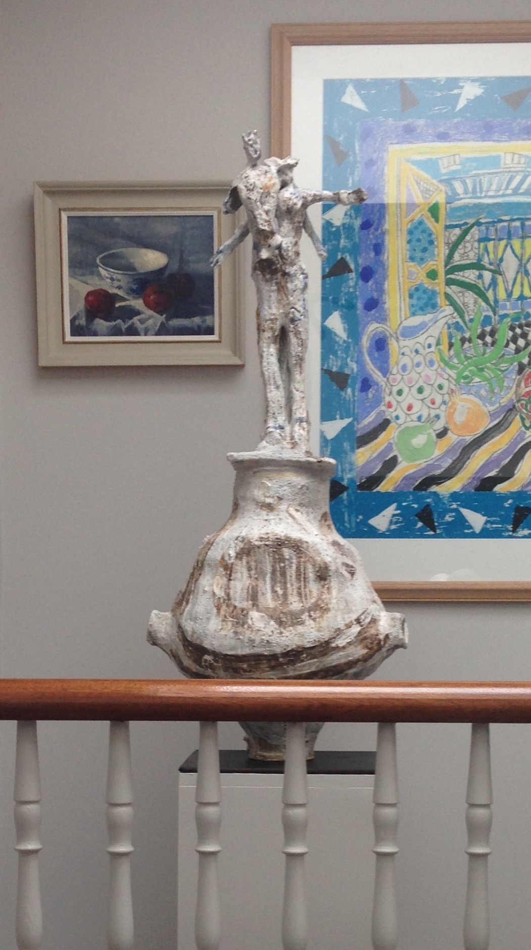 She told me that she draws inspiration for her pieces from artists she admires; in this case Giacometti. You will be aware that the greatest artists have learnt from others and she is a part of that continuum. I have shied away from buying pottery because of its fragility but every time I look at Caroline’s work it lifts my heart. She fires at a high temperature and uses oxides, a combination that gives her work a deceptive simplicity and also makes it robust. The pictures in the background are by Colin Willey and Nicholas Hely-Hutchinson, two artists living in Dorset whose work I have long admired.