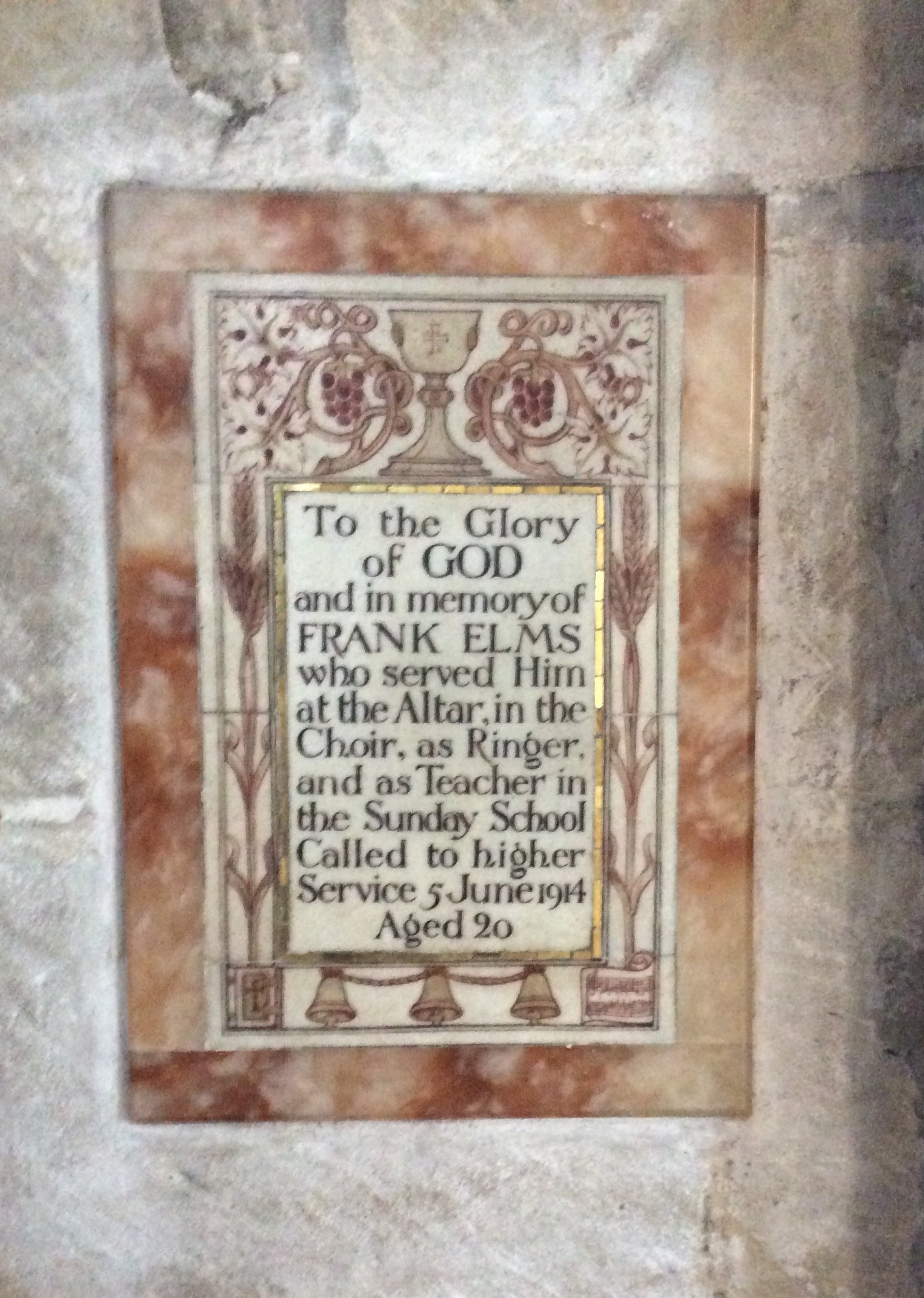 I chose this first because of its beautiful design reflecting top and bottom, his service as an altar boy and bell ringer. Secondly, because it is unclear why he died so young. Had he lived a little longer he would have been exposed to the horror of the Great War.