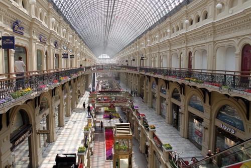 The inside bears a distinct resemblance to the GUM department store in Moscow (below), built in the 1890s. This is not really surprising as the Russian architect drew inspiration for the glass roof from London’s railway termini, which in turn were influenced by the design for glasshouses, which in turn was what Paxton designed.