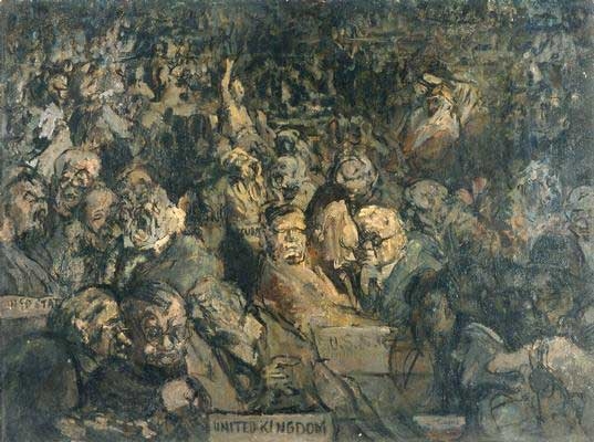 This is the first meeting of the United Nations, as depicted by Feliks Topolski. It took place in Methodist Central Hall in January 1946. The UN Charter had been signed in San Francisco in October 1945 by fifty countries. London was chosen for the inaugural meeting to acknowledge the role Britain played defying tyranny and to show what terrible damage had been inflicted on London in the war.