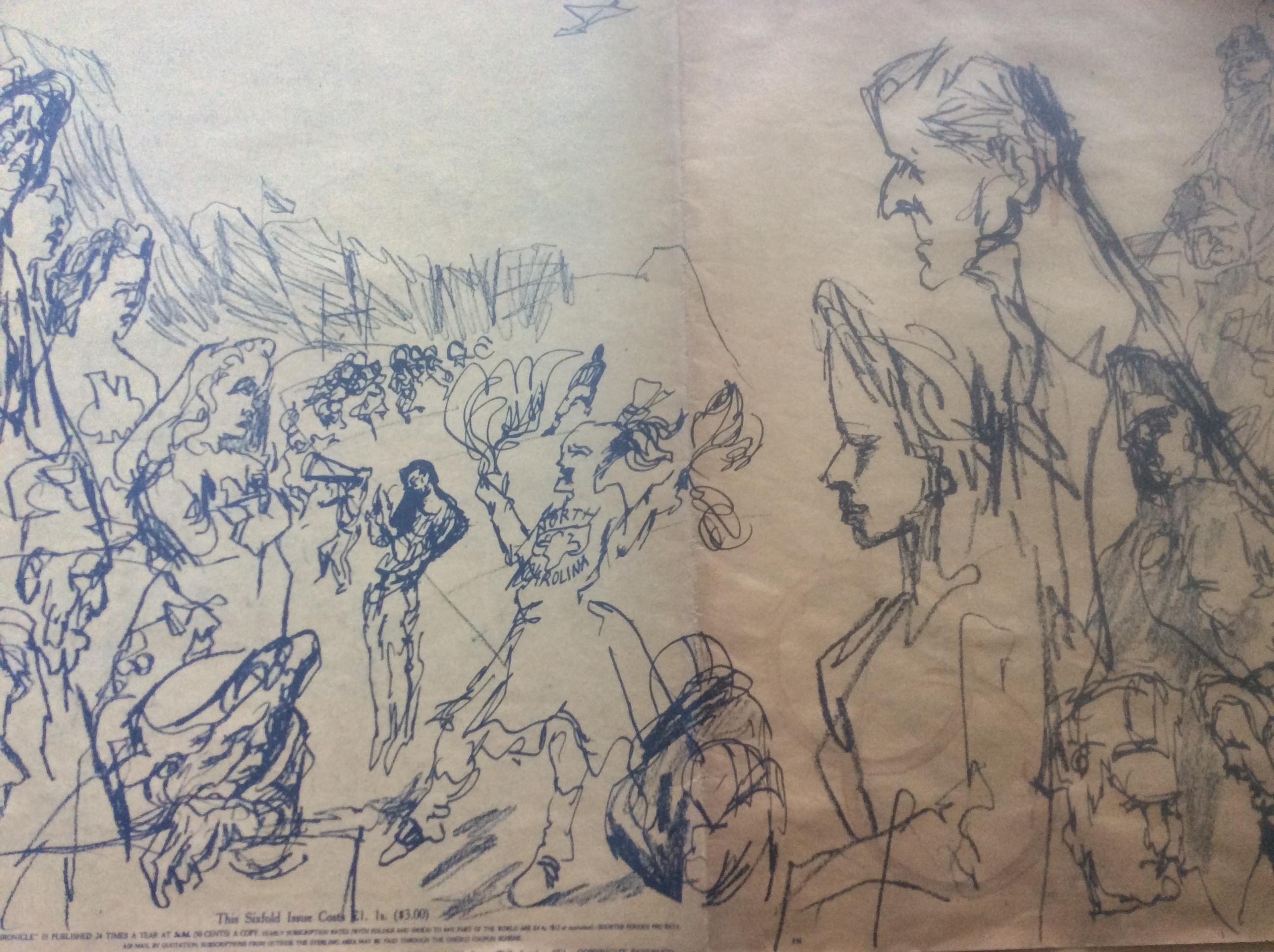 His studio, under a railway arch near Waterloo, is open as a cafe and music venue with some examples of his work on show. He published fortnightly Chronicles with drawings of events and people. The one I have is of a royal visit to the US and Canada in 1957.