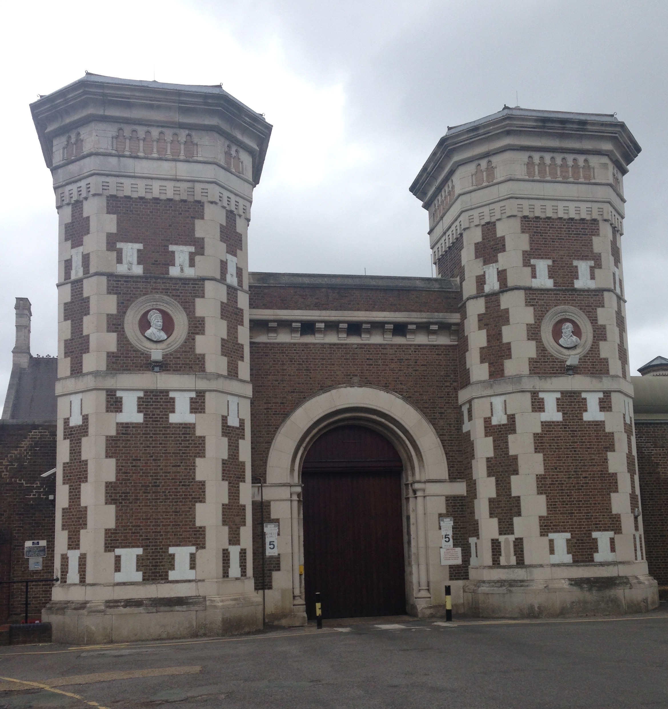 The Scrubs was built between 1874 and 1891. The two reliefs on the entrance towers are of Elizabeth Fry and John Howard, both early cheerleaders for prison reform. It’s Grade II listed on account of this iconic front door. It was my second visit; ages ago I came to a performance of Guys and Dolls in the prison chapel under the auspices of Pimlico Opera. The cast and orchestra were prisoners augmented by some professionals. The acoustics were shocking and my principal memory is of the end of the show. The audience were instructed to remain in their seats while the prisoners were led off to be locked up again; not a feel-good finale.