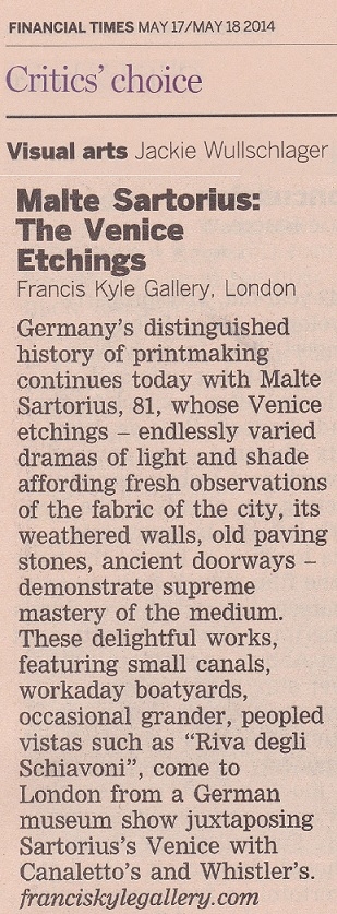 If you think you might visit, booking is advisable both for the exhibition and the restaurant at the top of the museum with super views of Oxford. On the other hand you might rather have your own drawing of Venice that you can look at every day. I have two etchings by Malte Sartorius, a distinguished 82 year old German print maker. His collection of Venice etchings has been compared to Canaletto’s Venice etchings. Take a look at them at the Francis Kyle Gallery website. Don’t go to their premises in Maddox Street, where I bought my pictures. After 36 years Francis has closed his gallery and sells through his website and from home.