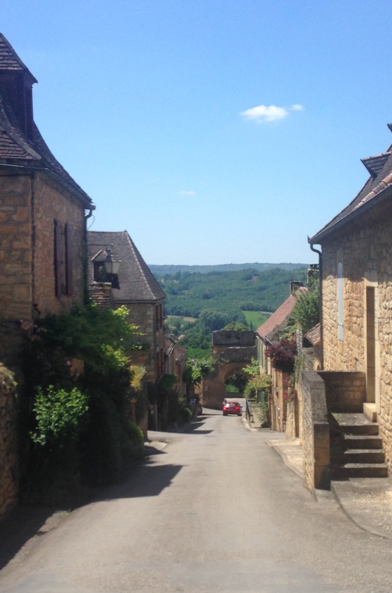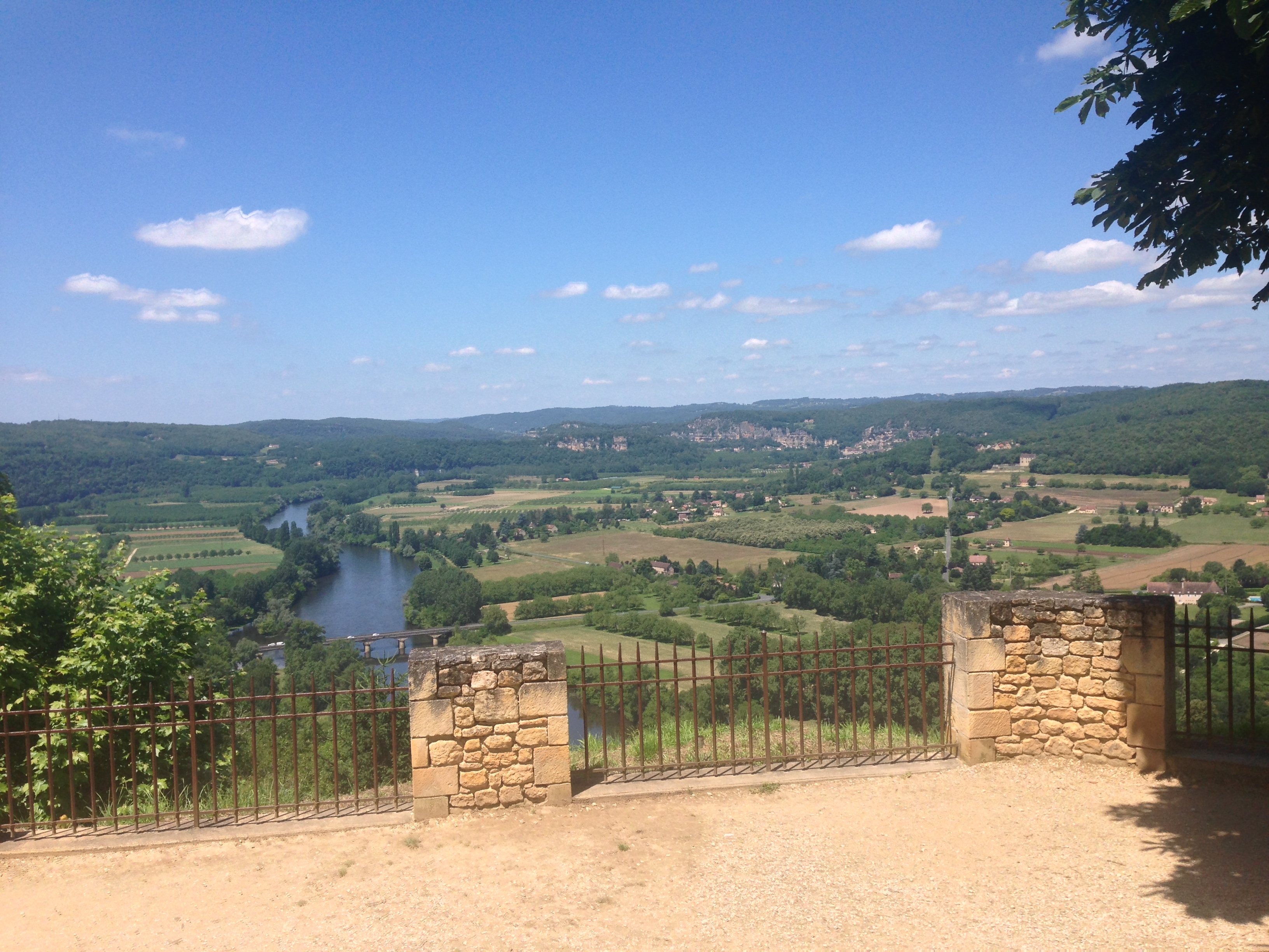 Yesterday we drove to the ancient fortified town of Domme perched above the Dordogne river. After a walk down to the river J directed us to a restaurant with an inviting terrace. Madam asked if we’d like a déjeuner rapide. She looked quite pleased when I expostulated that in fact we were in search of a déjeuner sérieux . Here is the view from her terrace.